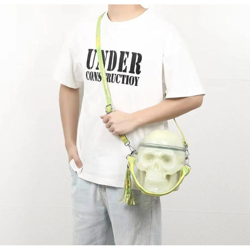 PADRISIMA BOLSA CON CARA DE CALAVERA, CIERRE A LA ALTURA DEL CEREBRO, ESPACIOSA COMO PARA 5 LATAS DE REFRESCO, LA FOTO DEL MODELO ES REFRECIA DEL TAMÑAO NUEVA PRECIOSA SUPER ORIGINAL